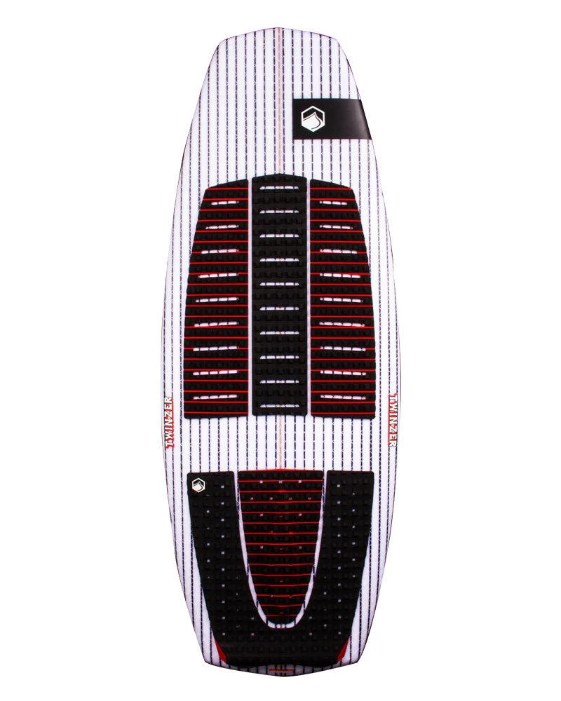 The Liquid Force Twinzer is best described as a wildcat, shaped to be fast and lively with plenty of drive. In a diamond shape design and working with a single concave hull, the Twinzer generates amazing speed and drive through the water. Crisp rails and its quad fin arrangement make the Twinzer one of the most reactive boards in the Liquid Force lineup, offering plenty of bites when transitioning and making it feel like a wider platform for sharp, precise transitions. Finished with a mixture of materials designed to enhance performance, the Twinzer had a lightweight EPS core with a wood stringer to absorb vibration and increase feel while also reinforced with Carbon and innegra lining.