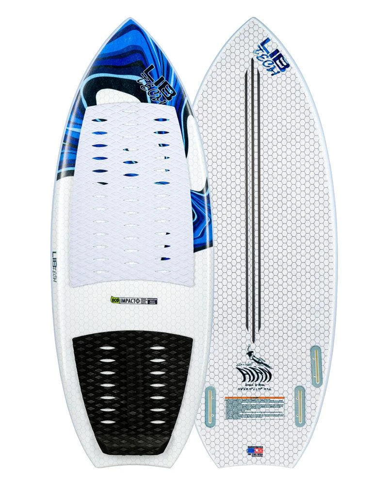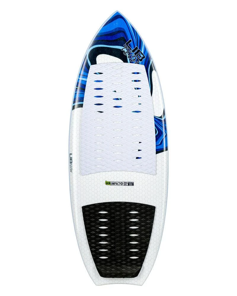 The Lib-Tech Air’n is the final creation of a lot of mad scientist tinkering by Lib-Tech craftsmen Aaron Witherall. Whittling down and experimenting with the Lib surf range led to the Air’n, a dream wakesurfer made real. This wakesurfer is designed with a wider profile wedge tail, offering control and a heap of pop off the wave, but with a lower profile flat rocker, it maintains maximum speed so you can get plenty of pump along the wave. The concaved base and dynamic ‘up-rail’ entry to a harder edge rail in the tail give the Air’n an incredibly precise edge hold and give it the perfect amount of response, allowing you to progress your wakesurfing at maximum pace. It wouldn’t be a lib tech product without a crazy concoction internally; the Eco Impacto construction is a mouthful and a lot to breakdown (get the full nerd below), but it offers you an amazing feel on the wave with a wild level of durability, eliminating chances of heel dings and potential knocks on the boats or the racks.